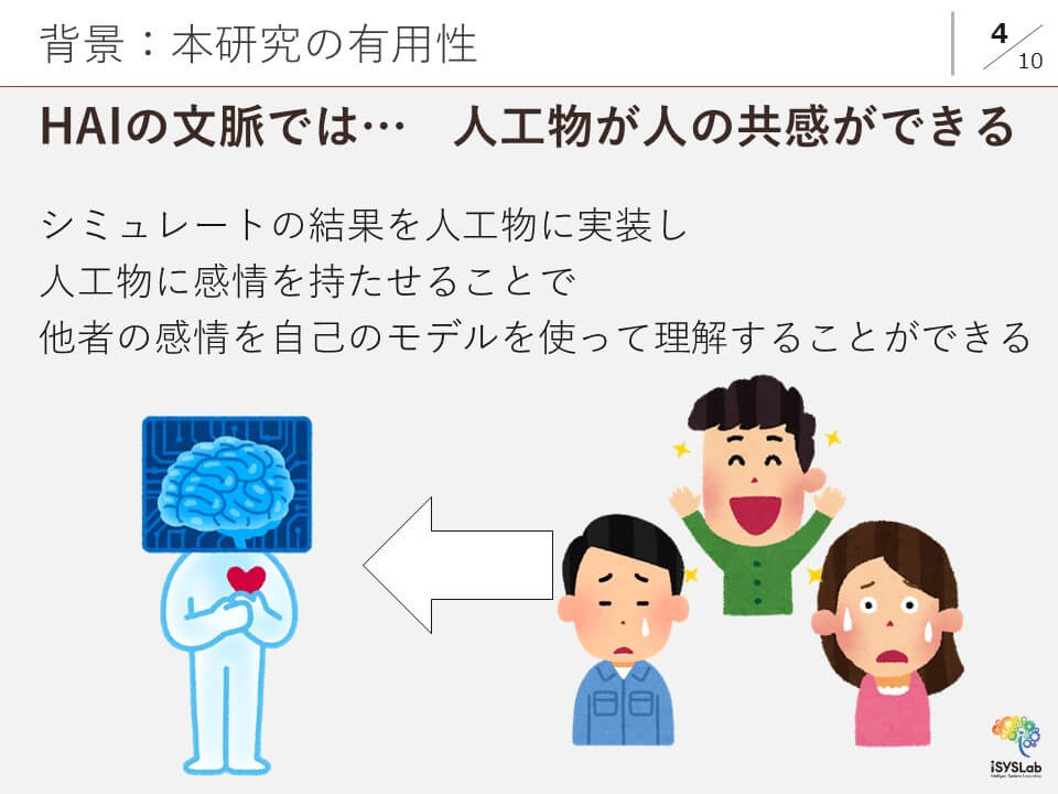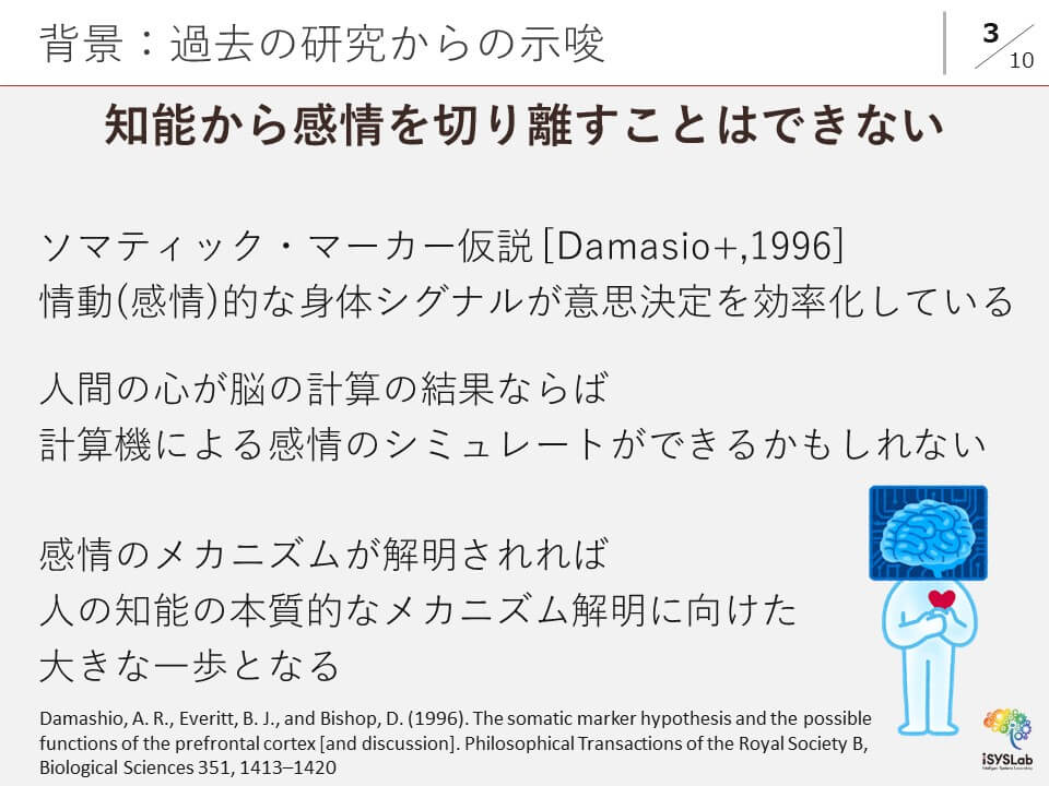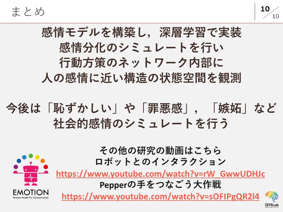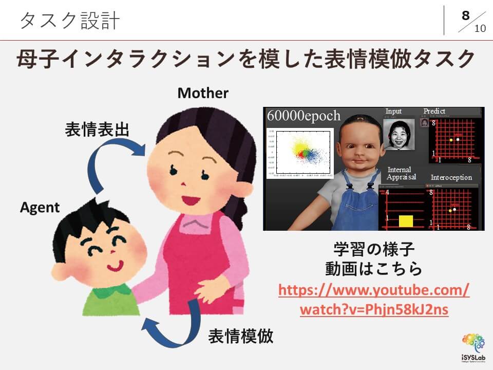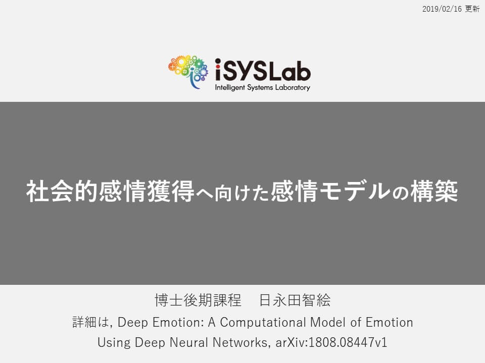 - 日永田 智絵, 堀井 隆斗, 長井 隆行, "行動決定に基づく感情分化", 第32回人工知能学会全国大会, 2018.6