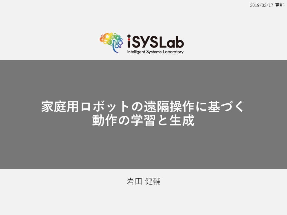 - 岩田健輔,長井隆行,中村友昭,青木達哉,"参照点と操作対象に依存した GP-HSMM によるロボットの動作学習",情報処理学会全国大会,7N-02,Mar.2018