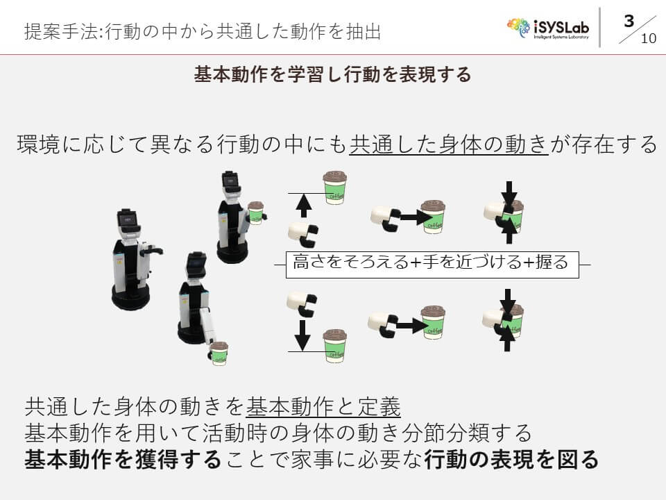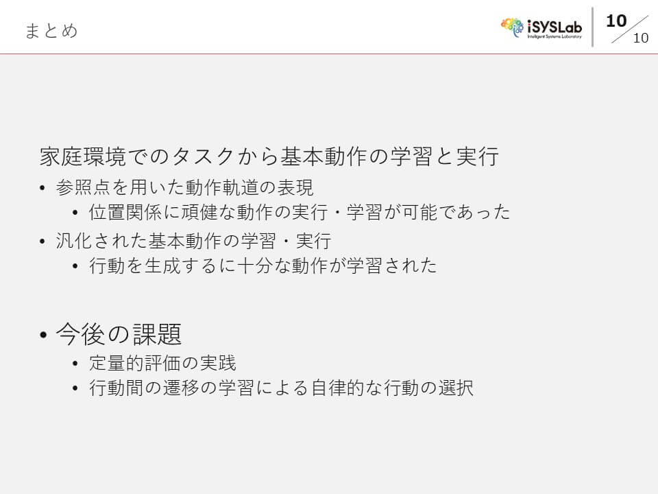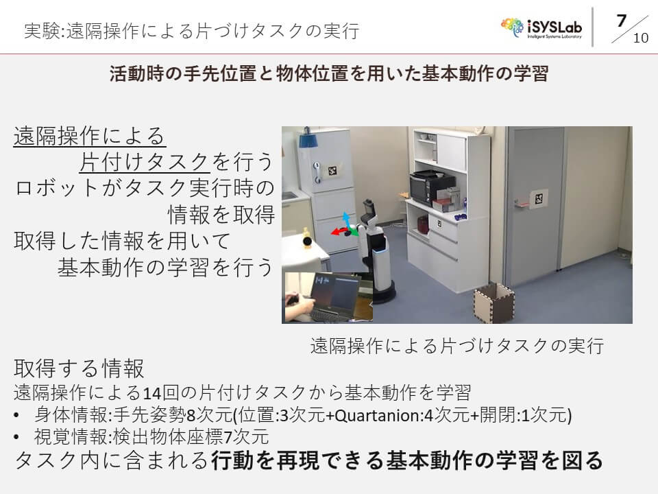 提案手法を用いた基本動作の学習により,片づけタスクから行動を表現できる動作の学習が可能となった.しかし,適切な状況での行動の選択や,学習した行動の定量的な評価は行えていない.今後は,行動の選択や評価が課題となる.
