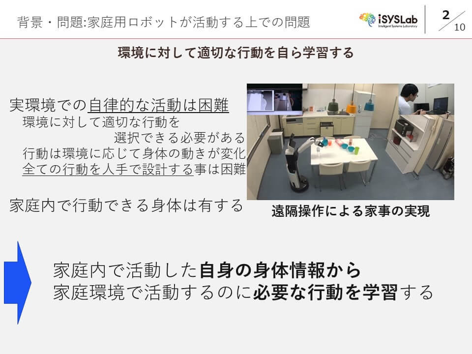 近年家庭用ロボットの開発が活発化している.しかし,いずれのロボットも一般家庭への導入はできていない.ロボットが一般家庭の中で活動するためには,その環境に適切な行動を実行できる必要がある.しかし,環境は多様であり,一意に決定することはできない.したがって,要求される行動全てを作りこむことは困難である.現在のロボットは遠隔操作で行動の実行と選択の部分を補うことで,家事を行うことが可能である.従ってこの行動とその選択を学習することが重要であると考える.本研究ではロボット自身が活動した情報から学習を行う.