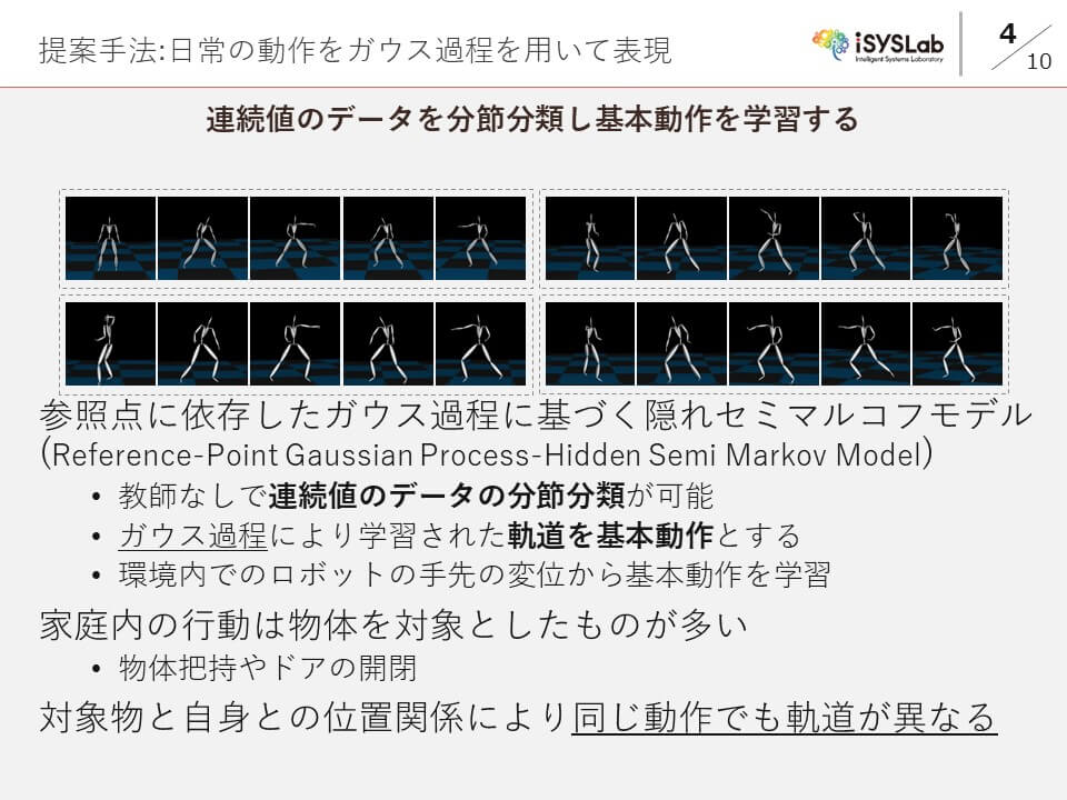 - K.Iwata, T.Nakamura, T.Nagai, "Learning of Motion Primitives Using Reference-Point- Dependent GP-HSMM for Domestic Service Robots," The 15th International Conference on Intelligent Autonomous Systems, Germany, June.2018