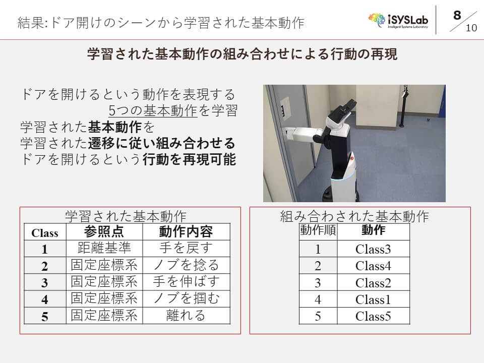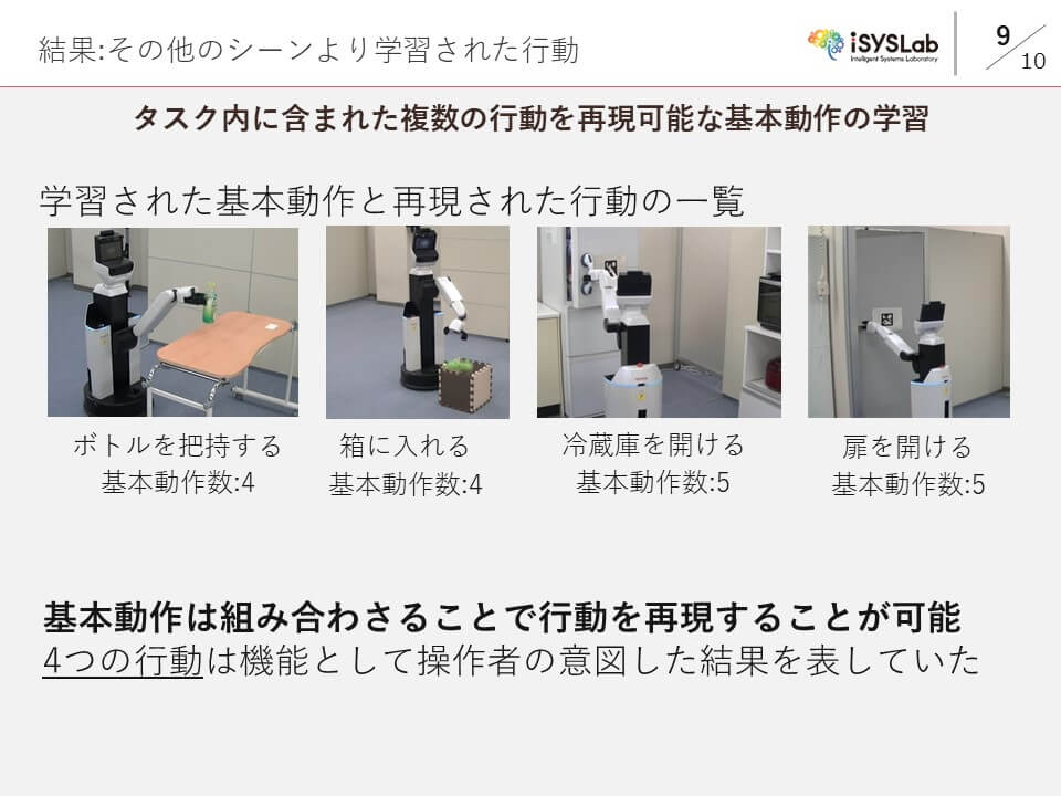 実際にこの手法を用いて,4 種類の行動を含む片づけタスクを行い,行動を表現できる基本動作の学習を行った.学習された基本動作は組み合わせることで行動として実行可能なものであり,操作者の意図した機能を達成できる行動が学習された.