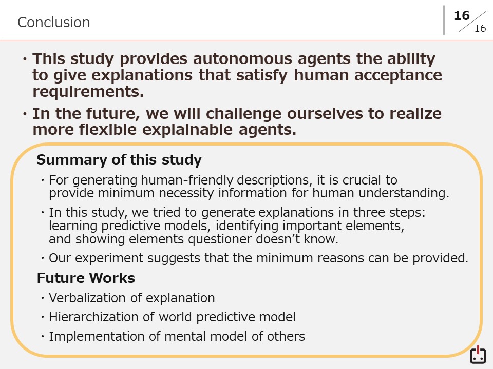 - A framework of explanation generation toward reliable autonomous robots," Advanced Robotics, Volume 35, Issue 17, pp.1054-1067, September 2021.