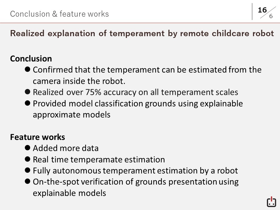 - Temperament estimation of toddlers from child–robot interaction with explainable artificial intelligence, advanced robotics, 2021.