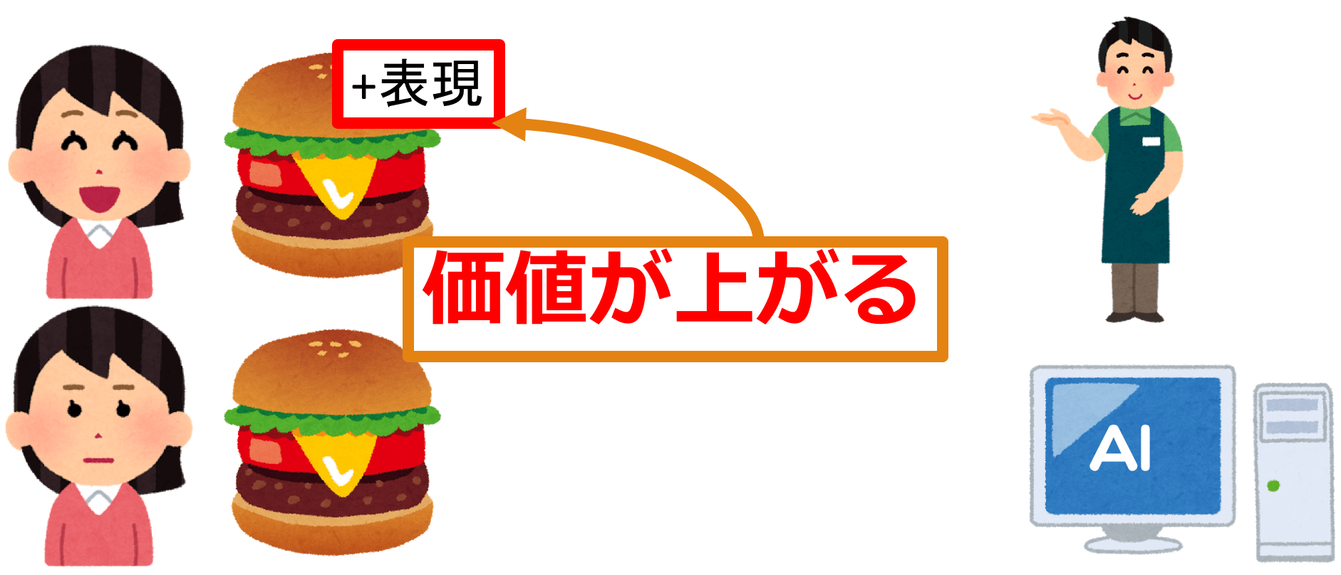 例として、商品の販売が挙げられる。人間と AI が同じ価値のものを売る場合、そのまま売るのであれば当然商品の価値は変わらないが、**人間はここに、身振り手振りやアイコンタクトなど様々な表現を用いて付加価値をつけることができる。**よって、将来的に AI がサービスロボットなどに搭載された際、相手とのコミュニケーションを行うにはこのような表現ができるような仕組みが必要になる。
