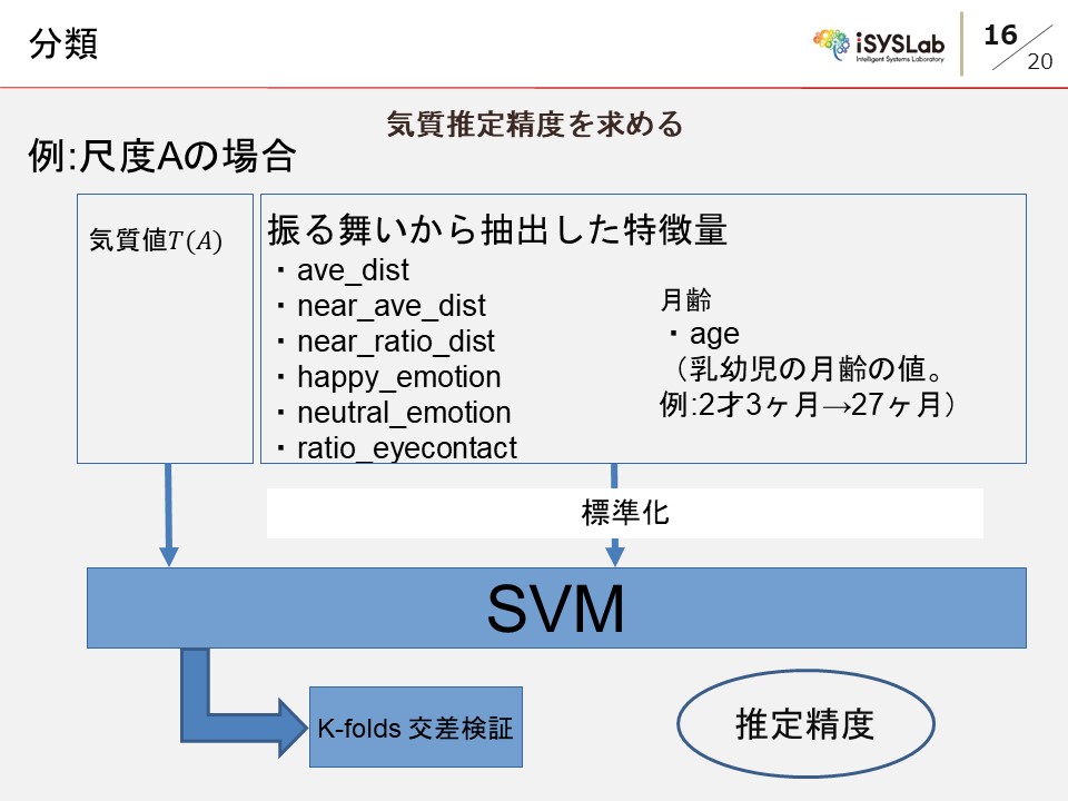 ロボットとのインタラクション中, 子どもごとにその振る舞いは異なる. 先行研究をもとに, 振る舞いの特徴が数値で現れる項目 3 つ”子どもとロボットの距離”、“表情(の確率)”、“子どもがロボットを見ていた頻度”に注目し, 画像処理により振る舞い特徴量を抽出する. 一方, 気質自体も先行研究で報告された気質質問紙を用いることで, 6 つの尺度の点数の組み合わせによって表現できる. 実際の気質を表すと言われる 6 つの尺度の得点傾向と, 振る舞いから得られた特徴量に何等かの相関があれば, 新たな振る舞い特徴量からおおまかな気質を推定することができる. SVM(support vector machine)を用いて分類を行い, k-folds 交差検証により気質推定精度を評価する.