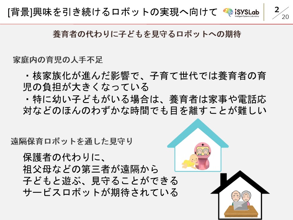 近年, 核家族化により子育て世代の育児の負担が増えている. 特に子どもが幼い場合は, 養育者が家事をする少しの間でも子どもからなかなか目が離せなかったり, 子どもが離れたがらなかったりする. そこで養育者の代わりに, 遠隔から祖父母等の第三者が子どもを見守ることのできるロボットの開発がなされている. ロボットを介して, 乳幼児と第三者が持続的にインタラクションするための必要条件として, 子どもの気質に合わせて柔軟に遊び方を変えるロボットの実現があげられる. 本研究ではその中間目標として, 子どもの振る舞いを遊び実験にて観測し, 気質を分析的に推定する手法を確立する.