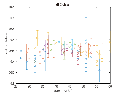 加速度の類似度を解析した結果、25 ~ 43 ヶ月にかけては類似度が上昇し、43 ~ 60 ヶ月にかけては類似度が下降する結果が得られた。この加速度の変化は、それぞれがバラバラの動きをしている過程から模倣の過程、その後、個人個人が周りの状況を考えながら自分自身で行動を決定して活動する過程への変化ではないかと思われる。